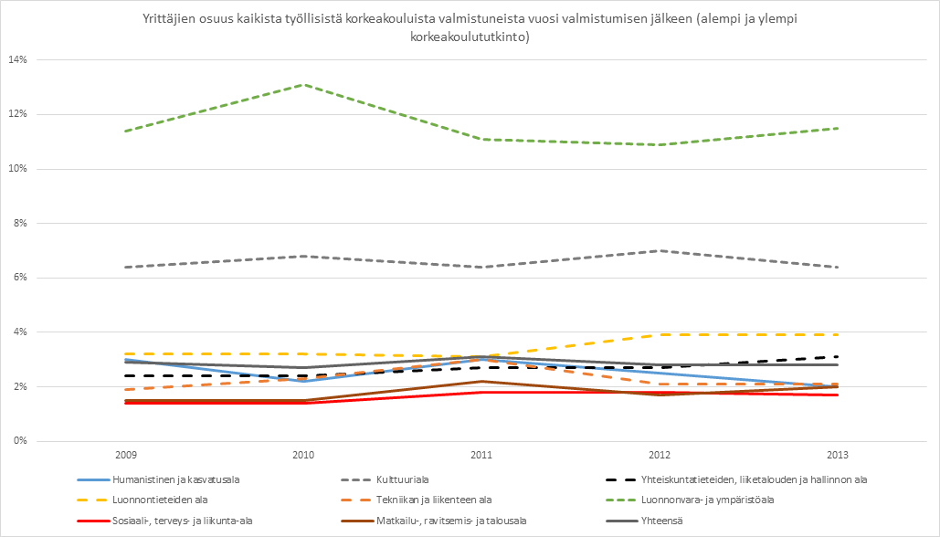 Vuosina 2009–2013 valmistui vuosittain keskimäärin noin 36 000 opiskelijaa korkeakouluista. Näistä noin 180 000 valmistuneesta noin 150 000 oli palkansaajia ja 5 000 yrittäjiä vuosi valmistumisen jälkeen. Tämä tarkoittaa, että keskimäärin työllisistä 97 % oli palkansaajia ja 3 % yrittäjiä. Yrittäjien suhde palkkatyöläisiin oli varsin samalla tasolla ammattikorkeakouluissa ja yliopistoissa.