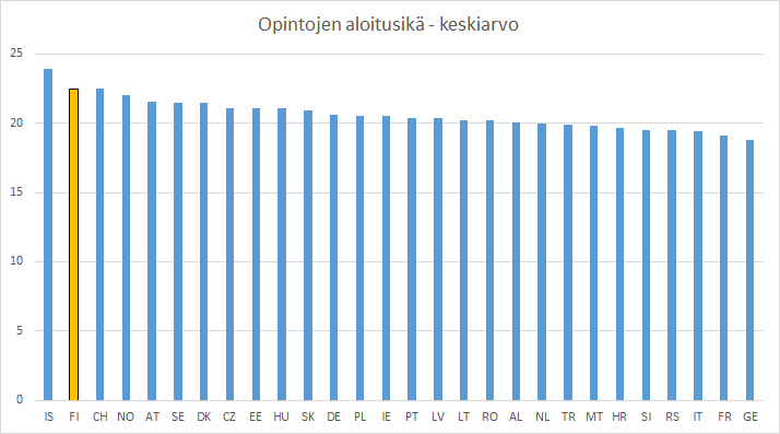 Kuva 1. Korkeakouluopiskelijoiden iän keskiarvo opintojen alkaessa.
