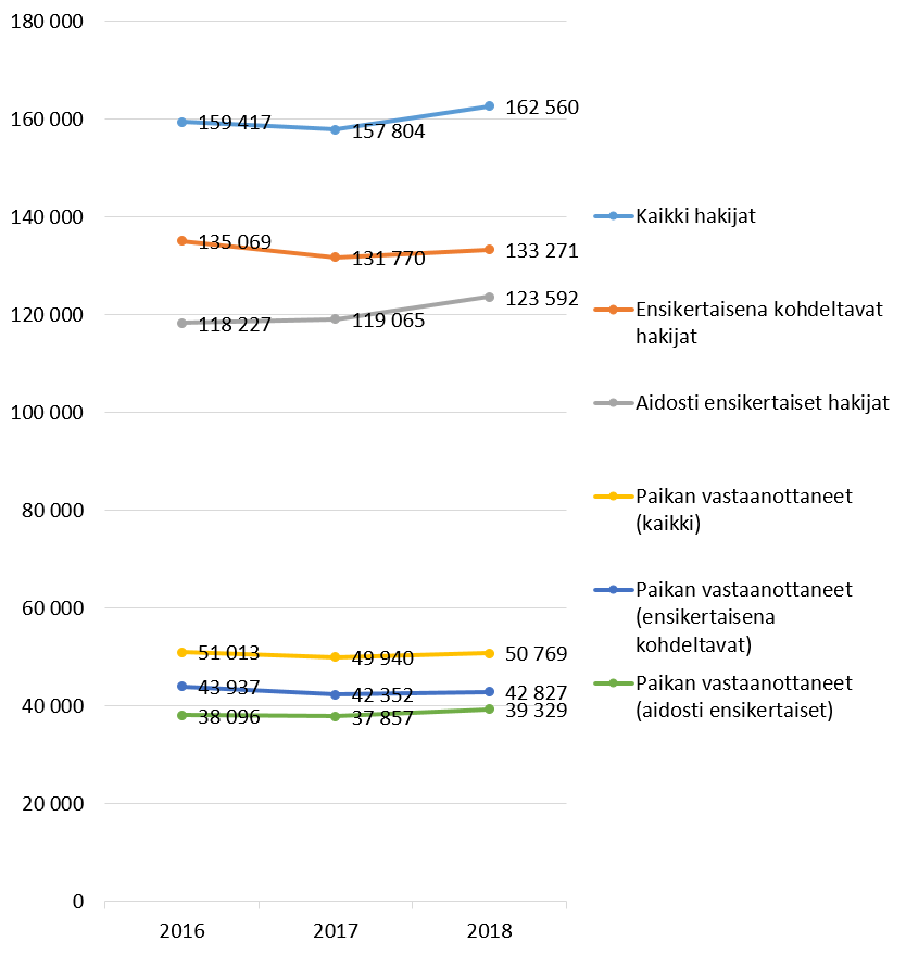 Hakijoiden kokonaismäärä ja myös aidosti ensikertalaisten hakijoiden määrä on hieman kasvanut 2016–2018 (kaavio 2).