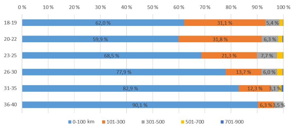 Kun tarkastellaan vanhempia ikäluokkia, lähelle hakeneiden osuus kasvaa. Mitä vanhempaa ikäluokkaa tarkastellaan, sitä suurempi on alle 100 kilometrin säteelle hakeneiden osuus. 36-40-vuotiaiden joukossa osuus on molempina vuosina jo noin 90%. Yli 300 kilometrin etäisyydelle hakeneiden osuus on lähes kaikissa ikäluokissa alle 10 %, mutta yli 30-vuotiaiden joukossa osuus jää noin viiteen prosenttiin.