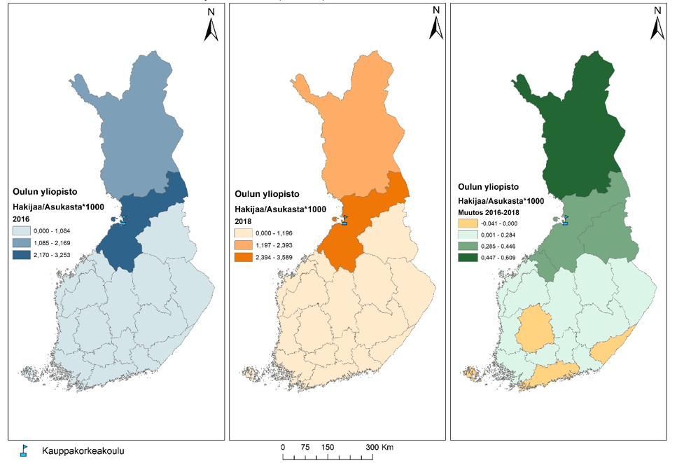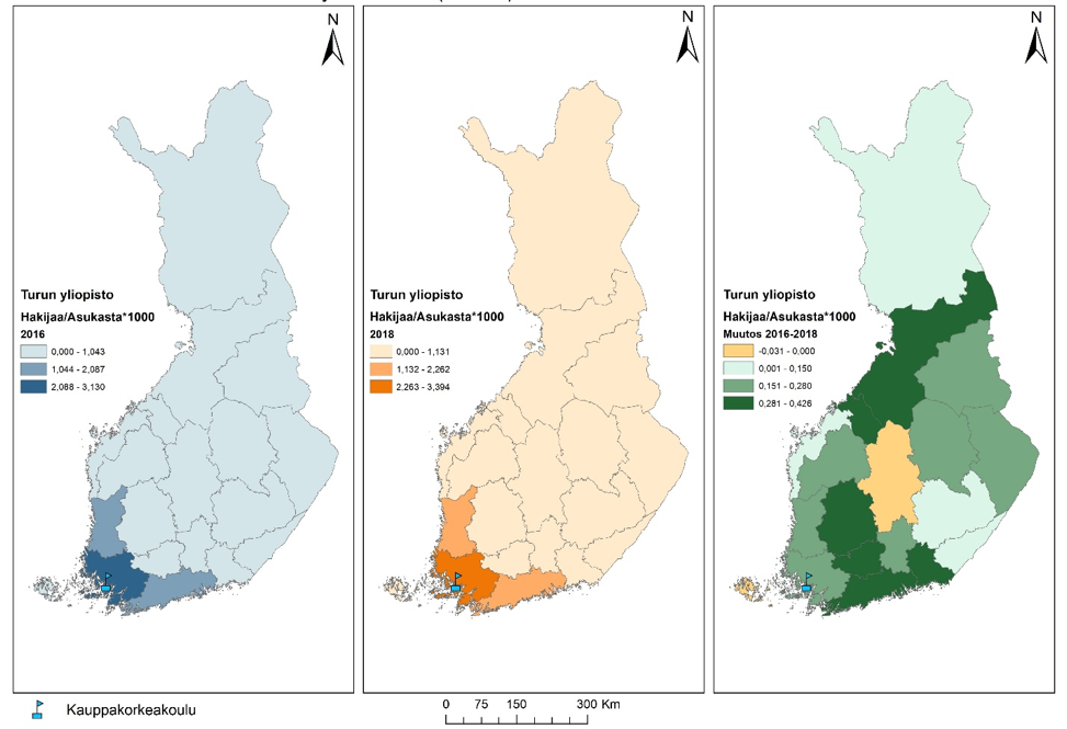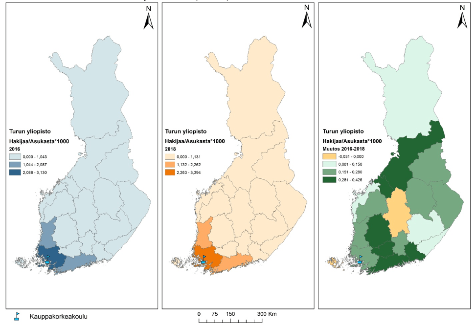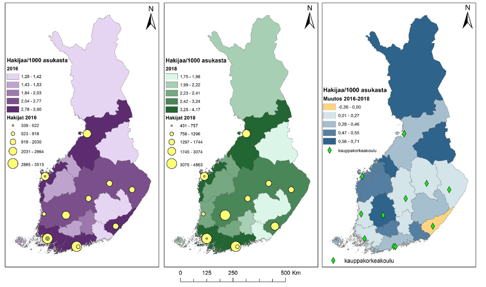 Mielenkiintoista kartoissa on se, miten hakijoiden määrä sijoittuu suhteessa kauppakorkeakoulujen sijaintiin ja hakijamääriin. Molempina tarkasteluvuosina hakijoiden määrä on ollut suurinta niissä maakunnissa, joissa sijaitsee kauppakorkeakoulu. Niissä maakunnissa hakijamäärät ovat olleet pienempiä, joissa ei ole kauppakorkeakoulua. Muutoskartasta voi huomata, että hakeminen on kasvanut kaikissa paitsi yhdessä maakunnassa (Etelä-Karjala). Toisaalta esimerkiksi Lappeenrannan teknillisen korkeakoulun hakijamäärä taas on kasvanut, eli hakijoita on tullut muualtakin kuin Etelä-Karjalasta. Todistusvalinta voi olla yksi vaikuttava tekijä, joka on lisännyt hakijamääriä myös sellaisissa maakunnissa, joissa ei ole kauppakorkeakoulua. Ilmiö vaatii kuitenkin enemmän selvittämistä.