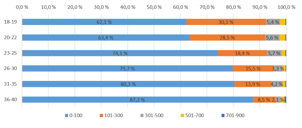 Kuvio 6: Yliopistoon hakemisen etäisyys ikäluokittain 18-40-vuotiailla 2018. Kuviossa tarkasteltu kauppatieteen 1:n syklin hakijoiden ylimpiä hakutoiveita.