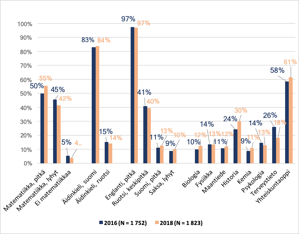 Kuviossa 1 nähdään, että pitkän matematiikan kirjoittaneiden osuus on kasvanut ja vastaavasti lyhyen matematiikan kirjoittaneiden osuus pienentynyt vuodesta 2016 vuoteen 2018. Reaaliaineista suurimmat muutokset ovat olleet historian ja terveystiedon kirjoittaneiden osuuksissa. Historian kirjoittaneiden osuus on kasvanut kuusi prosenttiyksikköä ja terveystiedon kirjoittaneiden taas laskenut kahdeksan prosenttiyksikköä. Kielissä ei sen sijaan ole merkittäviä muutoksia. Yhteiskuntaoppi oli jo ennestään kauppatieteiden opiskelijoiden eniten kirjoitettu reaaliaineena ja nyt sen rooli jopa hieman vahvistui.