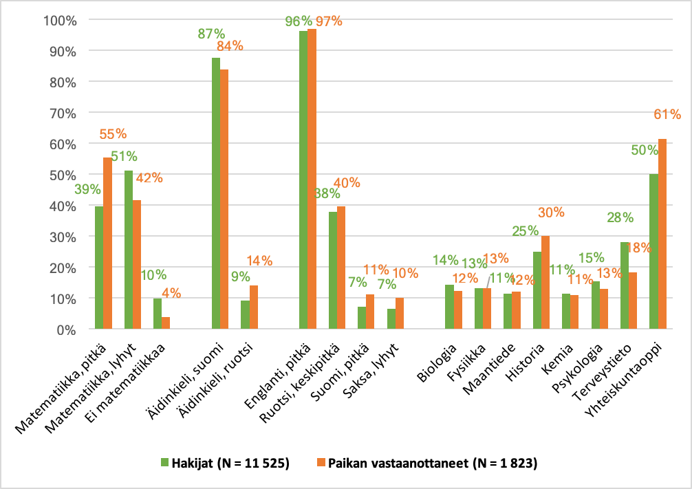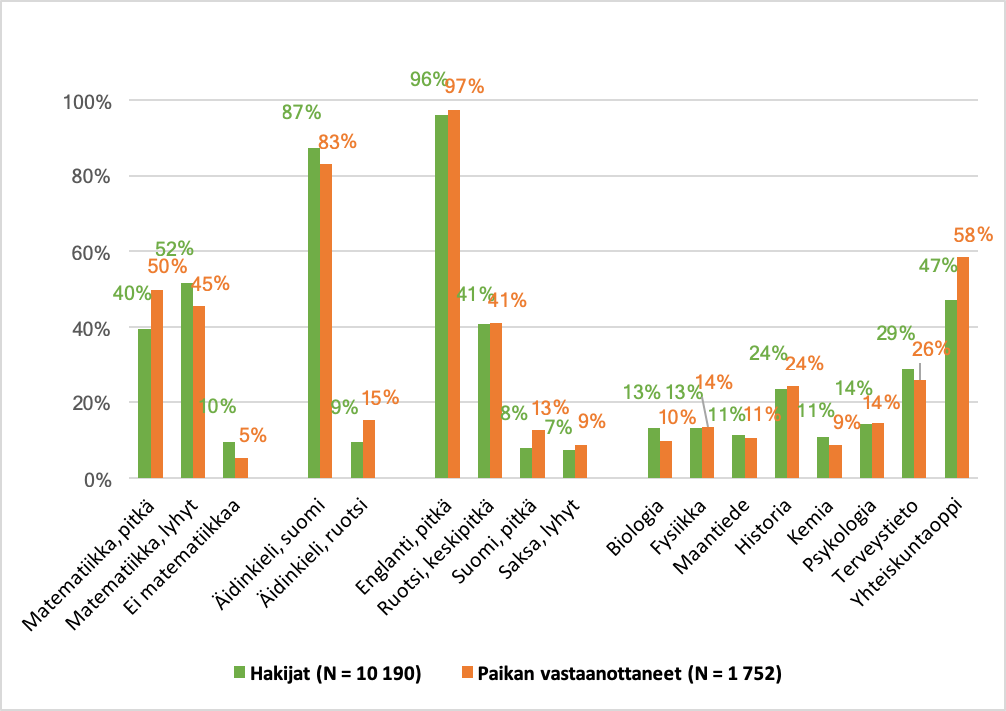 - Paikan vastaanottaneet kirjoittavat hakijoita useammin pitkä matematiikan, ruotsin äidinkielenä sekä yhteiskuntaopin ja vuonna 2018 myös historian. Terveystiedon kirjoittaneiden osuus sen sijaan oli suurempi hakijoiden puolella.
