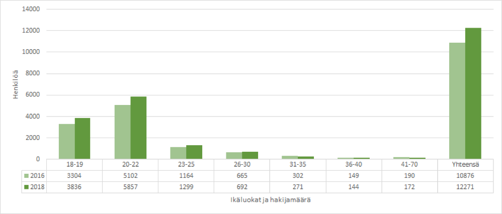 Kuvio 4: Hakijoiden määrä ikävuosittain 2016 ja 2018.