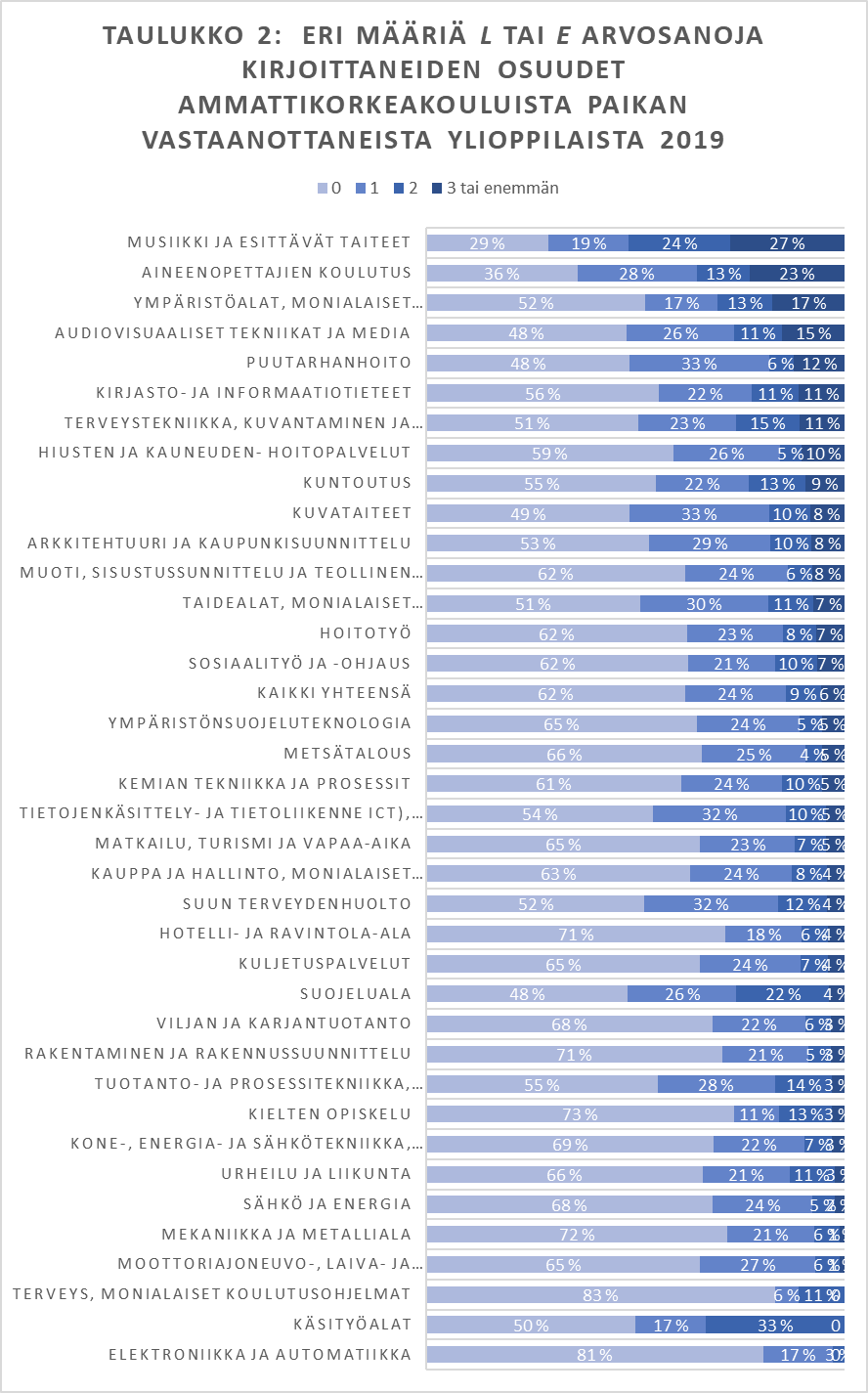 Taulukosta 2 nähdään, että ammattikorkeakouluista paikan vastaanottaneista 62 % ei ole kirjoittanut yhtään E tai L -arvosanaa, 24 % yhden, 9 % kaksi ja 6 % kolme tai useampia (rivi Kaikki yhteensä). Alakohtaista vaihtelua on myös ammattikorkeakouluissa.