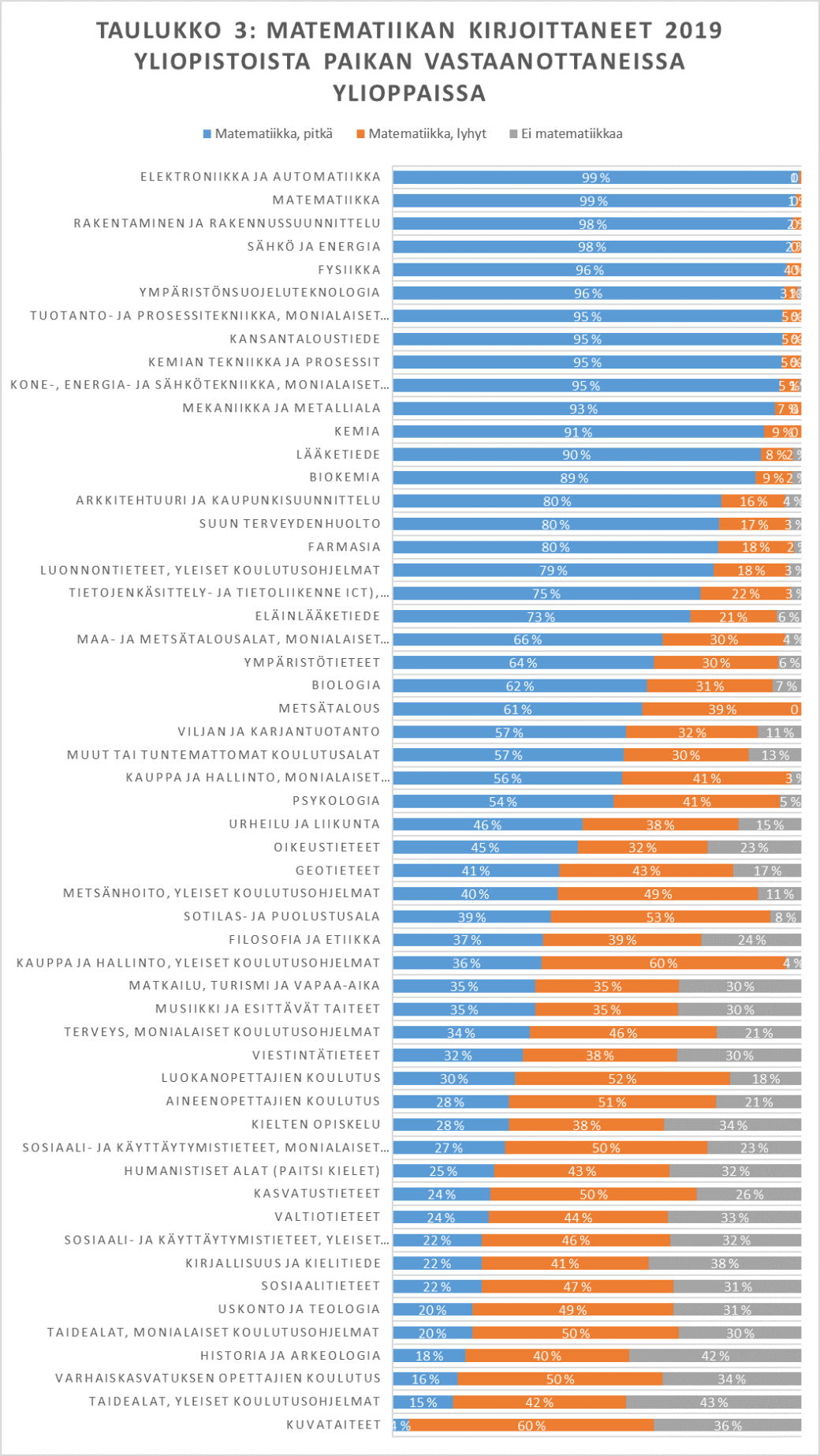 Matematiikan merkitys valinnoissa on herättänyt paljon keskustelua. Pitkän matematiikan kirjoittaneita päätyy hyvin painottuneesti tietyille aloille korkeakouluihin. Taulukosta 3 nähdään, että useilla aloilla yliopistoissa lähes kaikki paikan vastaanottaneet ylioppilaat ovat pitkän matematiikan kirjoittaneita. Osalla aloista painottuvat lyhyen matematiikan kirjoittaneet ja myös kokonaan matematiikkaa kirjoittamattomat.