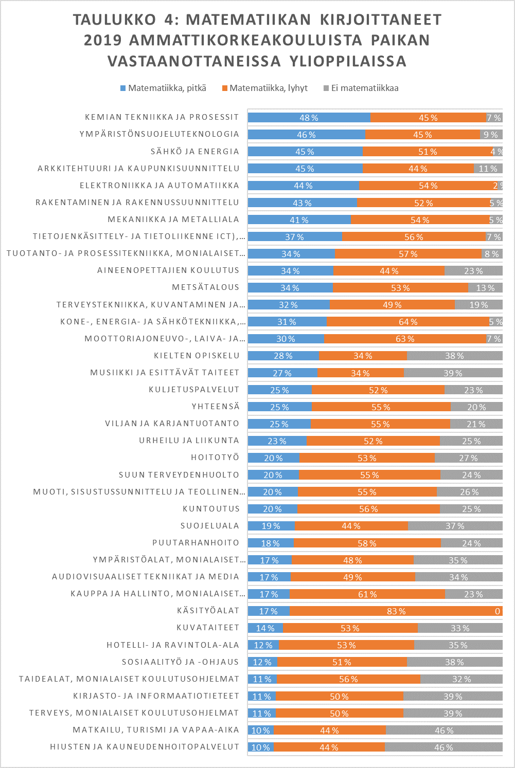 Taulukosta 4 nähdään, että ammattikorkeakouluissa pitkän matematiikan kirjoittajia on pienempiä osuuksia ja myös alakohtaista vaihtelua.