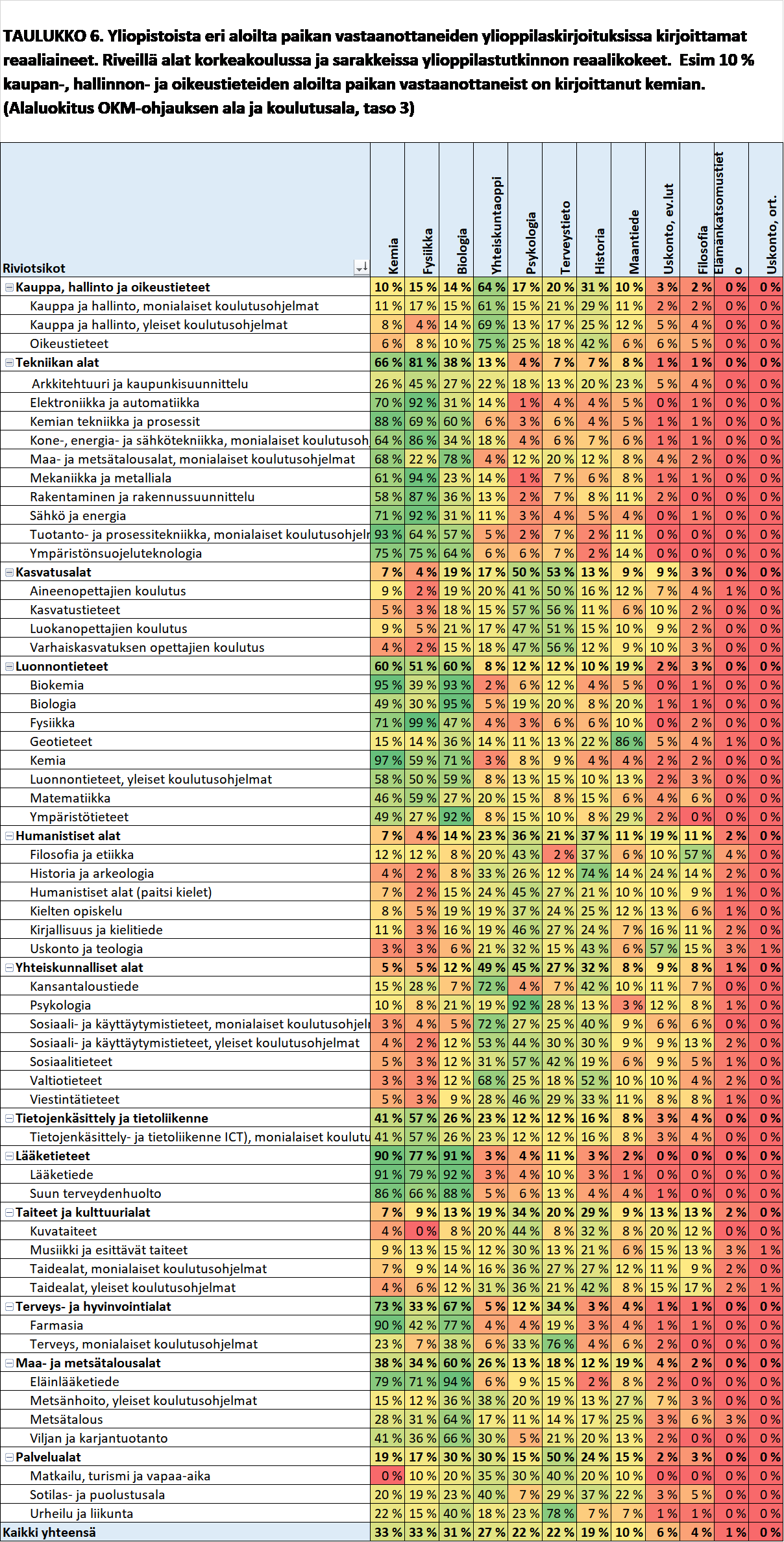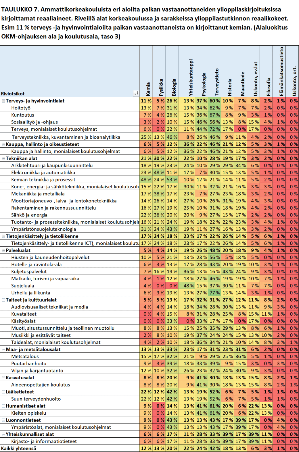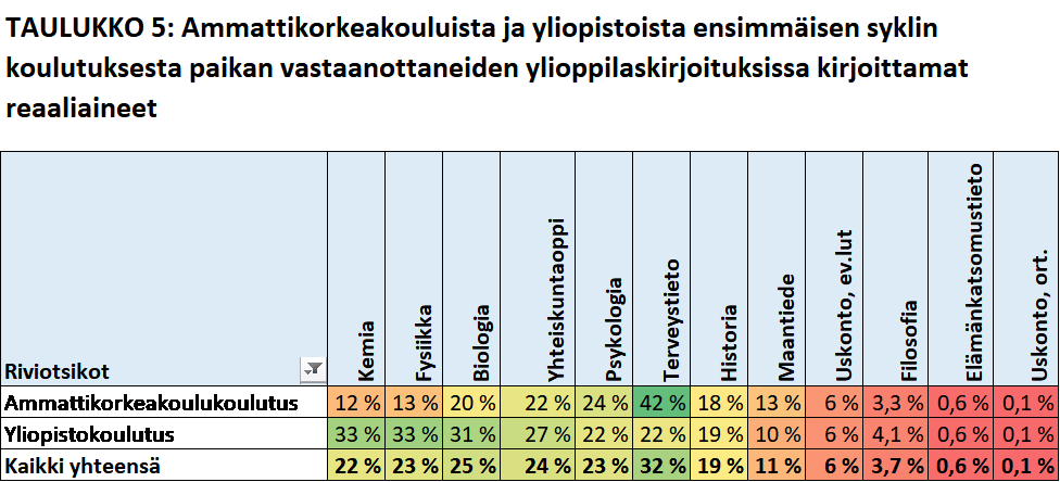 Taulukoissa 5, 6 ja 7 on yliopistoista ja ammattikorkeakouluista 2019 paikan vastaanottaneiden ylioppilaskirjoituksissa kirjoittamat reaaliaineet korkeakoulusektoreittain ja aloittain. Taulukoissa isot osuudet on väritetty vihreällä pohjalla ja pienet punaisella hahmottamisen helpottamiseksi.