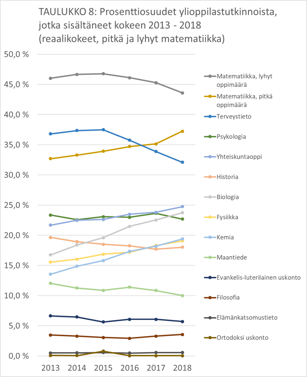 Taulukosta 5 näkyy korkeakoulusektorien ero paikan vastaanottaneiden kirjoittamissa reaalikokeissa 2019. Ammattikorkeakouluissa terveystieto on eniten kirjoitettu reaaliaine (42 %). Yliopistoihin päässeistä yli 30 prosenttia on kirjoittanut kemian, fysiikan tai/ja biologian. Luonnollisesti vähemmän suosittuja ylioppilastutkinnon reaalikokeita esiintyy paikan vastaanottaneilla vähemmän. Vertailun vuoksi alimpana kuviossa 8 on osuudet valmistuneista ylioppilastutkinnoista, johoin on sisältynyt tietty reaalikoe tai matematiikan koe, vuosilta 2013-2018. Vuosien 2013-2018 kehitys on tapahtunut ennen tietoa yliopistojen ja ammattikorkeakoulujen tulevassa todistusvalinnassa käyttämistä pisteytyksistä, jotka julkaistiin touko-kesäkuussa 2018.