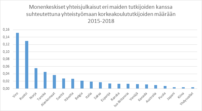 Kaavio 2: Monenkeskiset yhteisjulkaisut eri maiden tutkijoiden kanssa suhteutettuna yhteistyömaan korkeakoulututkijoiden määrään 2015-2018