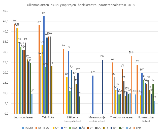 Aalto-yliopisto nousee tässä analyysissä esiin selvästi esiin henkilöstönsä määrällä tarkasteltuna kansainvälisimpänä yliopistona. Sillä on selvästi keskimääräistä enemmän muiden maiden kansalaisia töissä useimmilla päätieteenaloilla. Sen sijaan Lapin yliopistossa on kaikilla tieteenaloillaan keskimääräistä vähemmän ulkomaalaisia töissä. Keskihajonta yliopistojen välillä on tässä tilastossa suurinta luonnontieteissä (9,3) ja tekniikassa ja pienintä yhteiskuntatieteissä (6,6) ja humanistisissa tieteissä (4,9). Onkin kiinnostava havainto, että yliopistot ovat ihmistieteissä tässä suhteessa keskenään homogeenisempiä kuin STEM-aloilla. Jos luonnontieteissä ja tekniikassa on paljon muiden kuin Suomen valtion kansalaisia, voisiko ero selittyä väitöskirjatutkijoiden suurella määrällä?