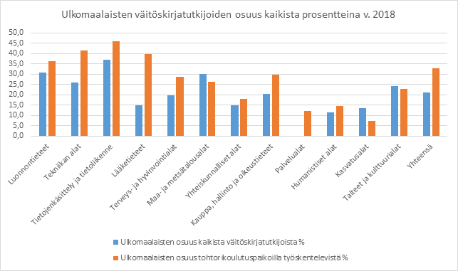 Kaavio 12: Ulkomaalaisten väitöskirjatutkijoiden osuus kaikista prosentteina v. 2018