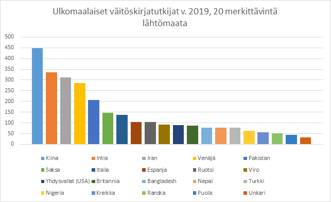 Kaavio 13: Ulkomaalaiset väitöskirjatutkijat v. 2019, 20 merkittävintä lähtömaata