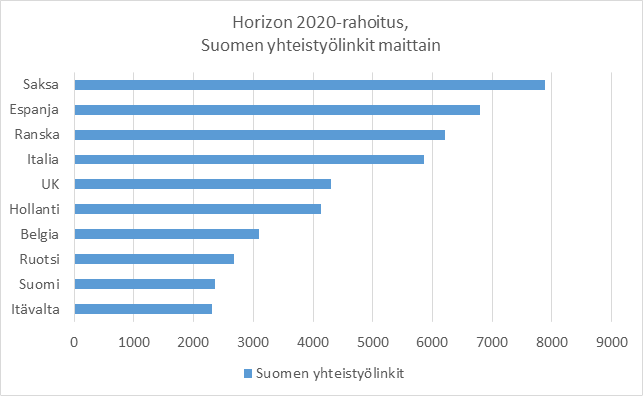 Kansainvälisestä tutkimusrahoituksesta ei ole käytettävissä kattavaa tilastoa kaikista yhteistyömaista, mutta yli puolet kansainvälisestä tutkimusrahoituksesta tulee kilpailluista EU-hankkeista. Näissä EU-hankkeissa Suomen keskeiset yhteistyömaat ovat Saksa, Espanja, Ranska, Italia ja Britannia. Seuraavina tulevat Alankomaat, Belgia ja Ruotsi. Puiteohjelmarahoitus kohdistuu ennen kaikkea tekniikan ja luonnontieteen aloille. Myös lääketieteen osuus on suuri. Jos tarkastellaan koko Horisontti 2020 –rahoitusta, Suomi on sijalla 13, kun Suomi-lähtöisessä tarkastelussa sijoitus on 9. Kokonaisuudessa Italia on ennen Ranskaa ja Kreikka ennen Ruotsia, mutta muilta osin yhteistyölinkit ovat vastaavat kuin Suomi-lähtöisessä tarkastelussa.
