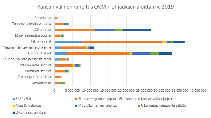 Kaavio 16: Kansainvälinen rahoitus OKM:n ohjauksen aloittain v. 2019, €