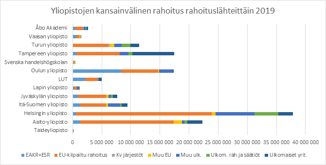 Kaavio 17: Yliopistojen kansainvälinen rahoitus rahoituslähteittäin 2019, €