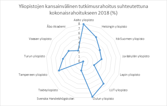 Kansainvälisen tutkimusrahoituksen rahavirrat eivät jakaannu tasaisesti Suomen yliopistoille. Rakennerahastorahoitus on erittäin merkittävää varsinkin Oulun yliopistolle (kaavio 17). Erityisesti luonnontieteet, tietojenkäsittelytiede ja tekniikka hyötyvät aluekehitysrahoituksesta (kaavio 16). Sen sijaan lääketieteen tutkimusta ei juurikaan rahoiteta aluekehitysrahoituksella. Myös Lappeenrannan-Lahden teknillinen yliopisto ja Itä-Suomen yliopisto hyötyvät sijainnistaan tukialueella. Kansainvälistä rahoitusta tulee eniten tekniikan aloille. Hyvin lähellä sitä ovat luonnontieteet ja seuraavana lääketiede. Aalto yliopisto, Oulun yliopisto ja Lappeenrannan-Lahden teknillinen yliopisto saavat eniten kansainvälistä rahoitusta suhteutettuna kokonaisrahoitukseen (kaavio 18). Helsingin yliopisto saa euromääräisesti eniten kansainvälistä rahoitusta.