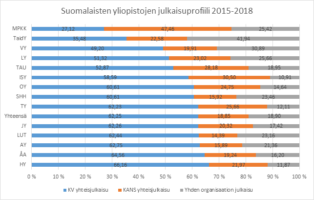 Kaavio 3: Suomalaisten yliopistojen julkaisuprofiili 2015-2018