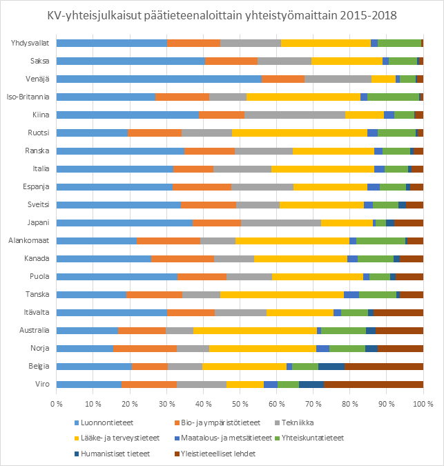 Tarkastellessa eri maiden kaikkien julkaisujen jakautumista eri päätieteenalojen välille, on selvää, että myös kansainvälinen yhteistyö jakautuu samoin näiden alojen välille. Toisin sanoen, Suomessa toimivat tutkijat julkaisevat tietyn päätieteenalan julkaisuja niiden maiden kanssa, jotka tuottavat muutenkin paljon kyseisen alan julkaisuja.
