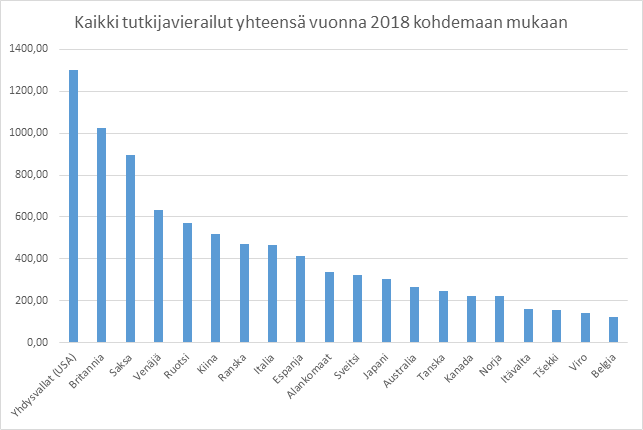 Kaavio 6: Kaikki tutkijavierailut yhteensä vuonna 2018 kohdemaan mukaan