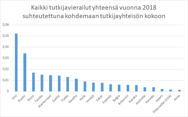 Kaavio 7: Kaikki tutkijavierailut yhteensä vuonna 2018 suhteutettuna kohdemaan tutkijayhteisön kokoon