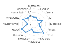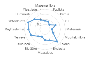 Miten koko Suomen tutkijoiden julkaisuprofiili painottuu. Julkaisuprofiilissa on suhteutettu alan osuus maan julkaisuista alan osuuteen maailmassa. Luku 1 tarkoittaa, että maassa julkaistaan alalla yhtä paljon kuin muualla maailmassa.