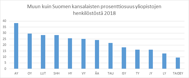 Henkilöstön kansainvälisyyttä voidaan tarkastella vertailemalla muun kuin Suomen kansalaisten osuutta eri yliopistojen henkilökunnassa. Taulukkoteknisistä syistä tässä tarkoitetaan ’ulkomaalaisilla’ henkilöitä, jotka eivät ole Suomen kansalaisia ottamatta kantaa heidän identiteettiinsä. Aalto-yliopistossa työskentelee suhteessa ylivoimaisesti eniten muiden kuin Suomen kansalaisia. Suuremmasta koosta johtuen Helsingin yliopistossa on kuitenkin töissä noin kaksi kertaa enemmän ulkomaalaisia. Muut yliopistot eivät tässä suhteessa eroa kovin radikaalisti toisistaan, vaikka eroja toki on.