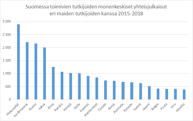 Kaavio 1: Suomessa toimivien tutkijoiden monenkeskiset yhteisjulkaisut eri maiden tutkijoiden kanssa 2015-2018