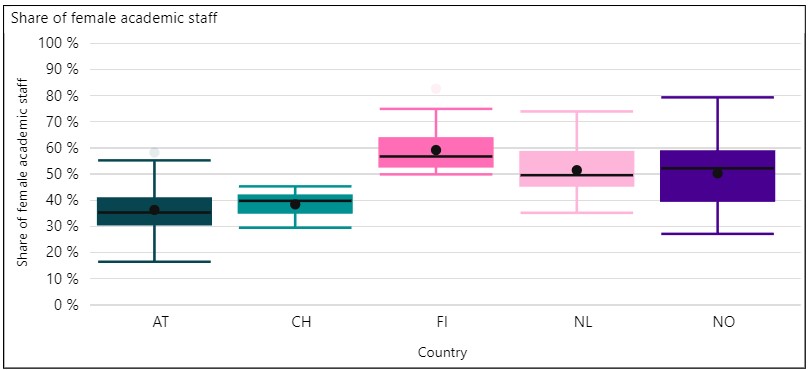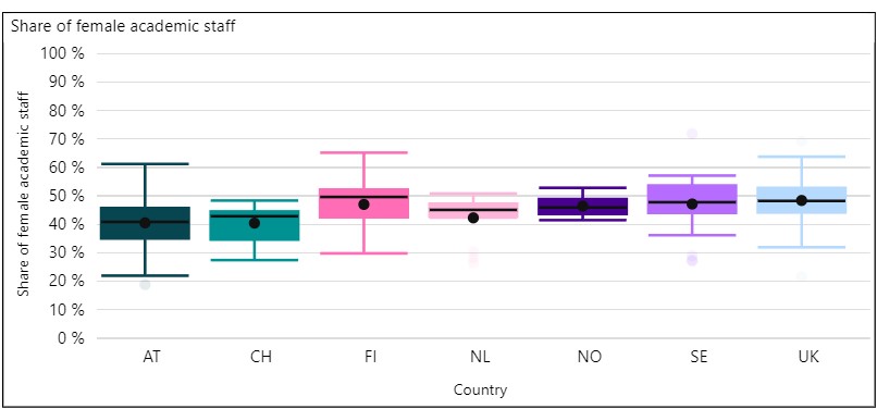 Vertaillessa professoreiden sukupuolijakaumaa yliopistoissa (kuva 12) huomataan, että naisia on suhteessa miehiin huomattavasti vähemmän. Suomen keskiarvo (33,1) on kuitenkin vertailumaista korkein. Itävalta ja Britannia erottuvat joukosta puolestaan suurella hajonnallaan, mikä viittaa siihen, että kyseisissä maissa yliopistojen välillä on selkeitä eroja. Eri yliopistojen tiedekuntien monimuotoisuus on yksi merkittävistä sukupuolijakaumaan vaikuttavista tekijöistä. Tyypillisesti teknisillä aloilla on enemmän miesprofessoreita kuin esimerkiksi humanistisilla ja terveys- ja hyvinvointialoilla.