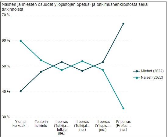 - Naisten ja miesten osuudet yliopistojen opetus- ja tutkimushenkilöstöstä sekä tutkinnosta