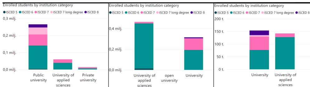 Itävallassa ammattikorkeakoulut ovat siis huomattavasti pienemmässä roolissa kuin esimerkiksi Suomessa tai Alankomaissa. Kuvassa 7 vertaillaan eri korkeakoulutyyppejä ilmoittautuneiden opiskelijoiden mukaan. Lila väri vastaa tohtoriopiskelijoita, jotka eivät ole mukana muissa opiskelijavertailuissa. Kuvasta 7 käy myöskin ilmi, että ammattikorkeakoulujen osuus on huomattavasti pienempi Itävallassa kuin se on Suomessa tai Alankomaissa. Suomi ja Alankomaat ovat tästä johtuen vertailukelpoisempia keskenään ammattikorkeakouluja tarkkailtaessa.