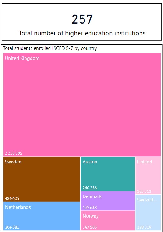 Yhteensä ammattikorkeakouluja on 46, joista suomalaisia korkeakouluja on 25 ja itävaltalaisia 21. Suomessa ammattikorkeaopiskelijoita vuonna 2019 oli 142 157 ja Itävallassa niitä oli 59 503. Itävaltalaisten ammattikorkeakouluopiskelijoiden osuus yhteissummasta oli siis alle 30%.