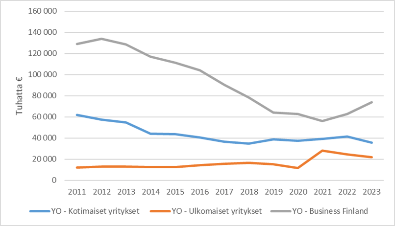 Kotimaisten yritysten rahoitus yliopistoille on laskenut runsaalla kolmanneksella tarkasteluajanjaksolla, ja vuodesta 2018 alkanut hienoinen kasvu taittui vuonna 2023. Muutosta parempaan siis vielä odotetaan. Opetushallinnon tilastopalvelu Vipusen tiedoissa vuoden 2024 osalta vaikuttaa, että niin kotimaisten kuin ulkomaisten yritysten rahoitus noudattelee aiempien vuosien trendejä. Ulkomaisilta yrityksiltä lähtöisin oleva tutkimusrahoitus on ollut kotimaista rahoitusta matalammalla, mutta koko lailla samalla tasolla vuodesta 2010 vuoteen 2020. Sen jälkeen on tapahtunut nousua ulkomaisten yritysten tutkimusrahoituksessa. Tarkasteluajanjakson aikana ulkomaisten yritysten tutkimusrahoitus yliopistoille onkin kivunnut jo varsin lähelle kotimaisten yritysten tutkimusrahoituksen tasoa.