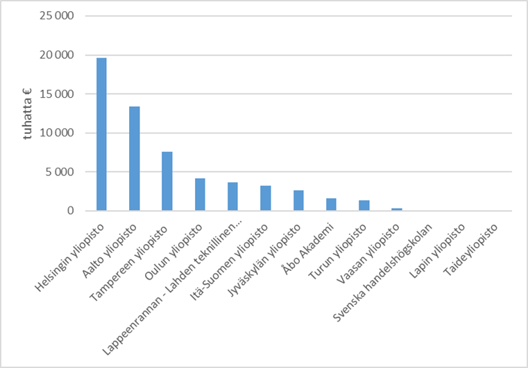 Kuvio 3. Yritysten rahoitus (1 000 €) yliopistojen tutkimustoimintaan vuonna 2023 (lähde: Vipunen).