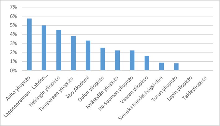 Kuvio 4. Yritysrahoituksen osuus yliopistojen tutkimuksen kokonaisrahoituksesta vuonna 2023 (%) (Lähde: Vipunen).
