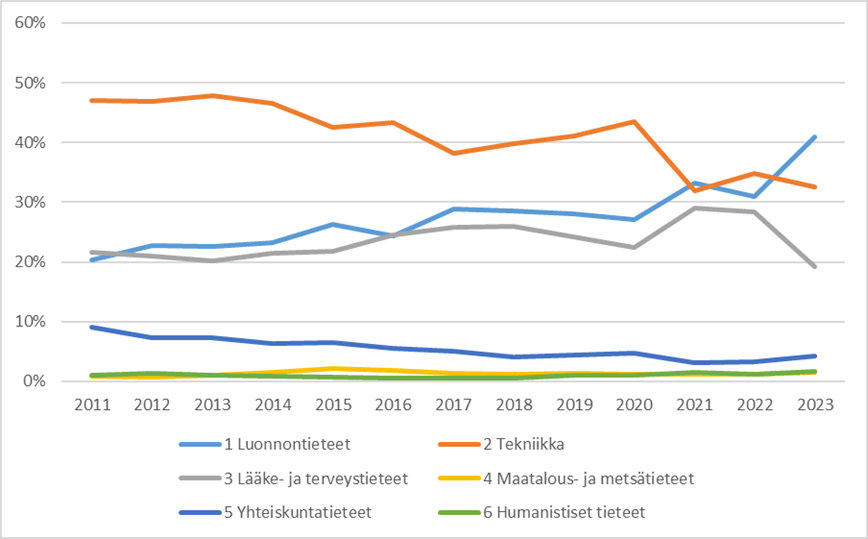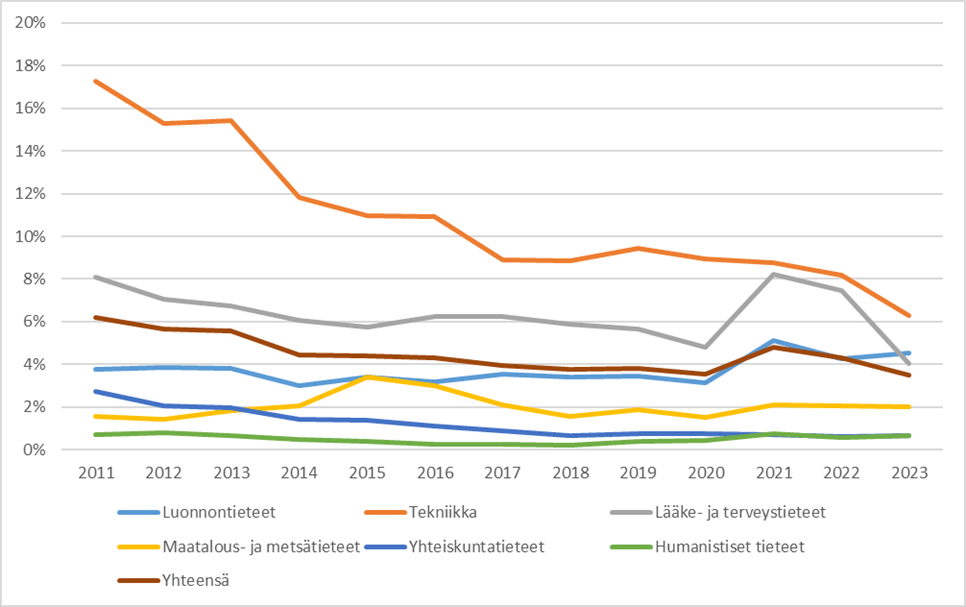 Kuvio 6. Yritysrahoituksen osuus (%) yliopistojen kaikesta tutkimusrahoituksesta päätieteenaloittain vuosina 2011–2023 (lähde: Vipunen).