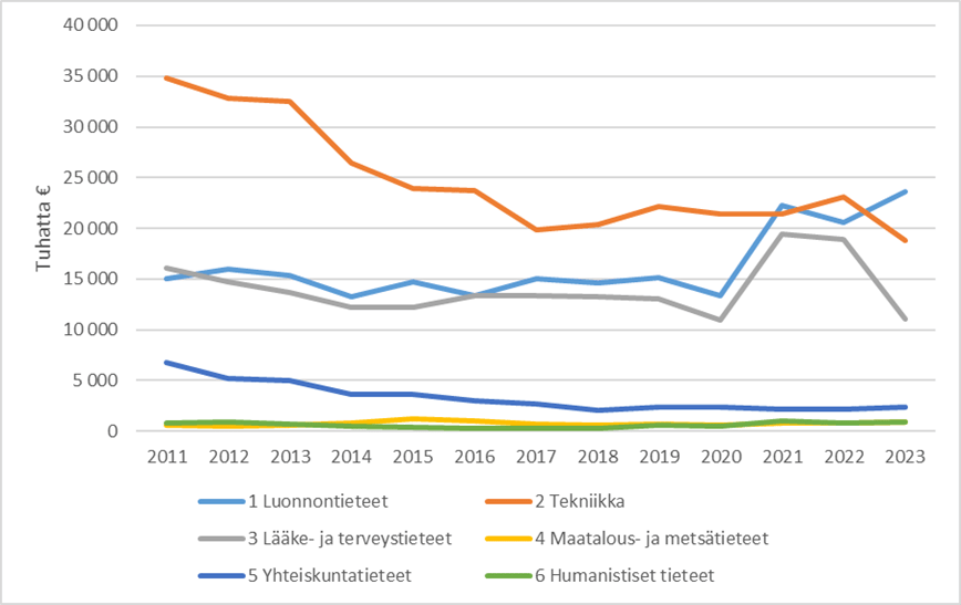 Kuvio 8. Yritysten tutkimusrahoitus (tuhatta €) yliopistoille päätieteenaloittain 2011–-2023 (lähde: Vipunen).