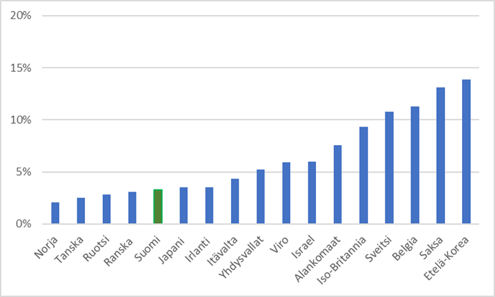 Kansainvälisesti tarkasteltuna yritysrahoitus on Suomessa muita Pohjoismaita hieman korkeammalla tasolla. Aiemmassa tarkastelussa Suomi jäi Ruotsin taakse (vuoden 2019 tiedot). Monissa muissa ns. verrokkimaissa yritysrahoitus on kuitenkin merkittävämmässä roolissa kuin Suomessa. Maat ja niiden tutkimus- ja innovaatiojärjestelmät poikkeavat monissa suhteissa toisistaan, ne eivät ole täysin verrattavissa keskenään.