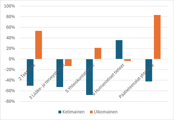 Yliopistojen tutkimusrahoitus ja sen volyymi kotimaisilta ja ulkomaisilta yrityksiltä vaihtelivat päätieteenaloittain vuonna 2023. Kaikilla päätieteenaloilla kotimaisten yritysten tutkimusrahoitus oli ulkomaista yritysrahoitusta suurempaa lukuun ottamatta lääke- ja terveystieteitä, joiden ulkomainen yritysrahoitus oli yli kaksinkertainen kotimaiseen yritysrahoitukseen nähden. Ulkomaisten yritys rahoitus tekniikan tutkimukseen on merkittävästi vähäisempää kuin kotimaisilta yrityksiltä. Vain maatalous- ja metsätieteisiin kohdistui saman verran tutkimuksen yritysrahoitusta kotimaisilta ja ulkomaisilta yrityksiltä.